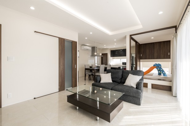 子育てを楽しむ家。 モダンテイストのLDKと和室スペースは子供の動きを抑制することなく見渡せるよう間口を大きくし、キッチンもフラット対面とした。小上がりの和室スペースは段差を活かし、収納として活用するなどアイデアを凝らした。ベランダも日当たりや家事等を考え全室から出入り出来る造りに仕上げている。 建物概要 所在地 館林市 工期 18.05~18.11 敷地面積 282.31㎡ 延床面積 115.92㎡ 工法 木造軸組